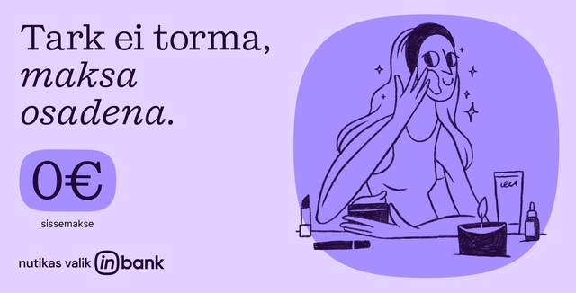 Teenuse pakkujaks on AS Inbank Finance. Enne lepingu sõlmimist soovitame sul tutvuda finantsteenuse tingimustega ja vajadusel konsulteerida spetsialistiga. Inbanki järelmaksu krediidi kulukuse määr on 10,51% aastas järgmistel näidistingimustel: järelmaksu summa 500 €, lepinguperiood kuudes 12, intressimäär 9,9% ostusummalt, lepingutasu 0 €, sissemakse 0%, haldustasu 0 €, igakuine osamakse 44,05 €, krediidi kogukulu 528,53 €.